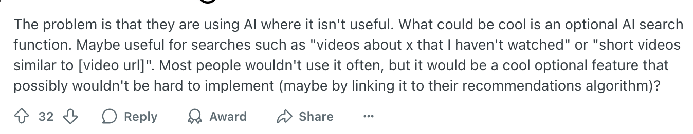 I started my research process by investigating how the online community is responding to the AI implementation to find pain points. Ultimately, the Reddit forum r/YouTube gave me the most detailed and relevant feedback on pain points within the AI feature.